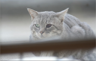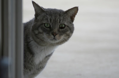 So there’s this cat. This magnificent, aloof, probably feral cat, who has gradually been slinking closer and closer to our door over the past few weeks. I immediately named him (I think him…could be her) Grey, because he is so unbelievably, totally, utterly grey. Except for his little green eyes and pink nose, that is. So we’ve been feeding him nice portions of tuna and leaving the sliding door open in the hopes of gaining his trust. Last week, as we sat in amazement, he even stepped inside and sniffed a bit. Then he marked his territory by rubbing his cheeks and chin on the door jamb, and went back outside to sit near the pool for a spell.