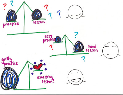 Thanks for a great post! As a beginning student, I really dig this post and your philosophy on the lesson/practice 'D' balance. Right now it feels like EVERYTHING is a challenge, and I suppose that's the way it's supposed to feel – for quite a while, from what I'm hearing. However, I can definitely tell the difference in my lesson when I've been putting in the extra practice time at home and really PRACTICING (not just trying to play the song over and over).