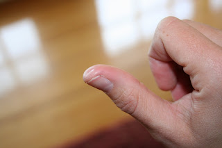 I would say that her bow grip is working, and will work beautifully with the natural evolution that comes with dedication and the obviously good tuition she is receiving. One thing I would like to clarify is that my thumbnail is not, after looking at the photos, exactly parallel to the floor. An issue she has that every student of mine (and there have been hundreds by now) fights with is the temptation and sometimes the need, to grind one’s thumb into the frog. One way to alleviate this issue may seem like a good idea at first: increase the surface area of contact by either straightening the thumb, or rotate onto the broader, flat portion of the thumb tip. In the end, I find that this just sort of spreads the issue instead of resolves it. So here’s an exercise that I like to offer my students. As with most pillars of my teaching, it is what helped me break the painful habit of Thumb of Doom.